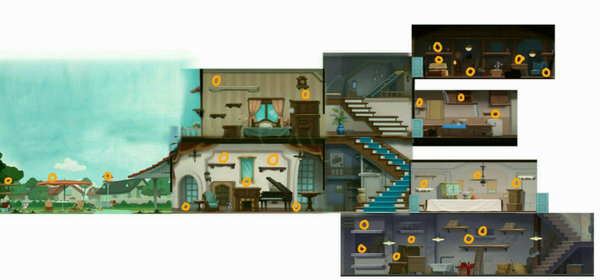 橙色路线:拿阁楼的药水 一直往左走去通往杂物间的管道,然后拿杂物间的的药水,一路清理道具到厨房拿药水。