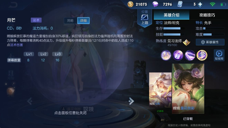 一技能 : 命中敌方/中立单位有标记,可以由嫦娥的普攻和技能引爆二技能 : 技能施法位置和自身位置同时产生漩涡,每秒造成伤害