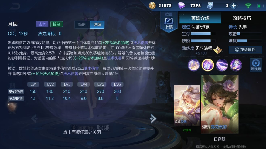 嫦娥 : 官方定位【法师】【坦克】,推荐位置上单,本人不才目前也只发现一种打法