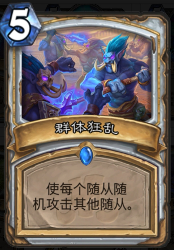其实在之前的版本,就有核弹牧的雏形,但是苦于快攻的泛滥,一直只能作为一个娱乐卡组而存在。但是在最新的大乱斗版本中,牧师的前期苟命能力得到了史诗级加强,因为新版本为牧师增加了一张前期苟命神卡:群体狂乱