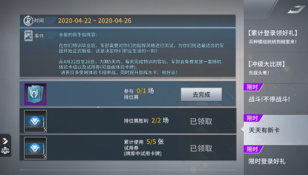 7.目前的三个限时任务,可以获得合金*2300,工程蓝图如果拿满也有20张,还有十个个试用卷和每天一套限时卡组,都是可以玩的蛮爽的,还可以让我这个小白来体验一下卡的功能,来看以后是不是要买。