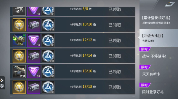 1.新手七天登录,目前我登录了七天,获得了合金*7520、卡牌战地技师和突袭者,以及一些礼包合金卡啥的。如图,只玩了七天2.等级提升奖励,目前我是18级,获得了合金*8104、卡牌生物医疗兵和模组紧急护盾,以及一些礼包和军费啥的。如图:3.通行证的每周每日任务,提升通行证等级领的奖励,目前我是lv10标准通行证,得到了合金*1500以及一些礼包和经验卡啥的。如图,图一是每日任务,图二是我目前的等级: