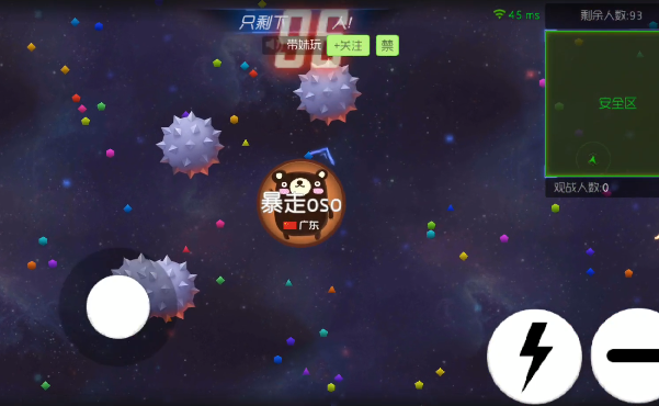 球球进去到能碰刺的时候旁边有大球与小球在身边的时候,这时候就需要吐球分身吃小球跑路。这样就可以走在吃些豆球就变大了。