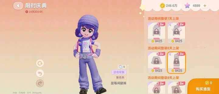 进入活动商店后,使用金币或满愿星购买部件,每日登录可解锁2个新部件,累计登录12天可集齐全部时装。