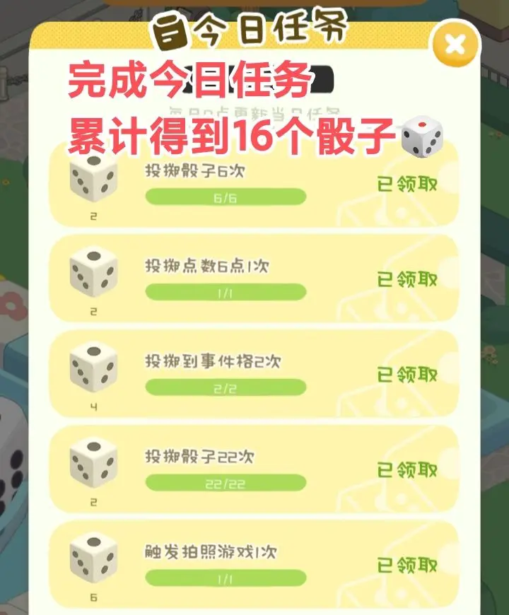 每日骰子数量,完成今日任务,领取更多的骰子,请看下图:
