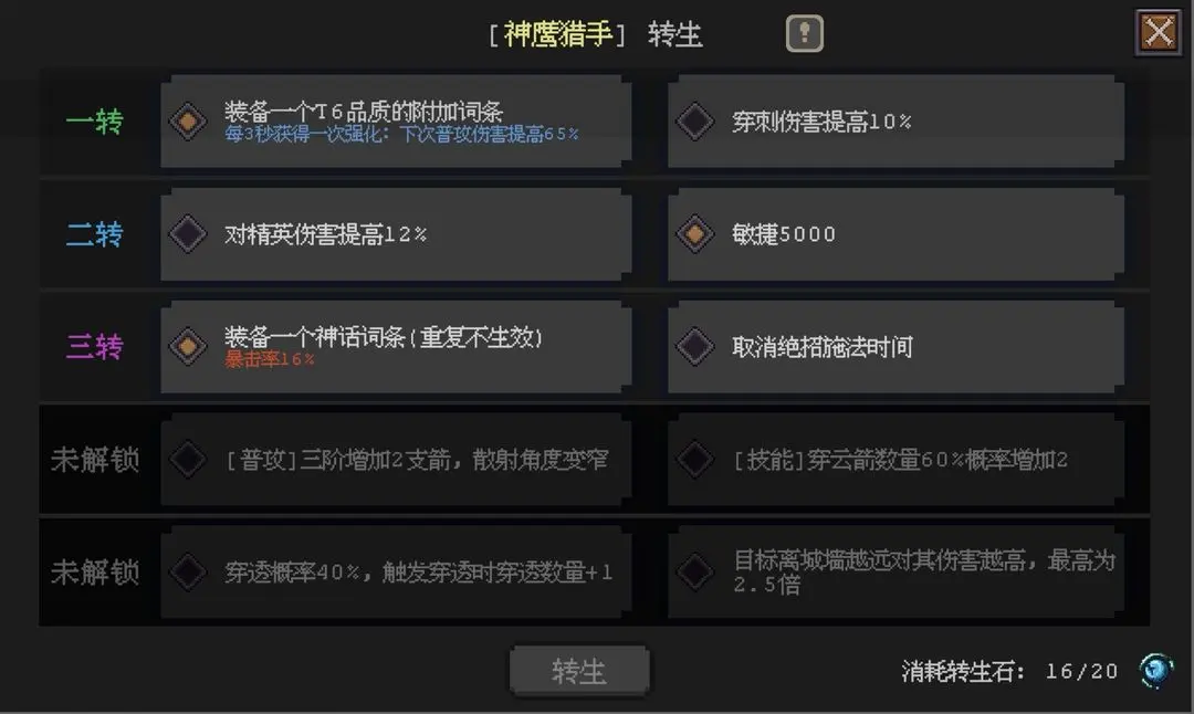 基础15级普攻技能提供210%穿刺伤害,配合三阶进阶效果的5支45%伤害箭矢,实际单次普攻总伤可达472.5%。四转后箭矢数量提升至7支,理论伤害增至661.5%。五转的距离加成机制使最终伤害在1-2.5倍区间浮动,经实战测试平均加成为1.75倍,使得五转神鹰的常态普攻伤害稳定在1157.6%左右。