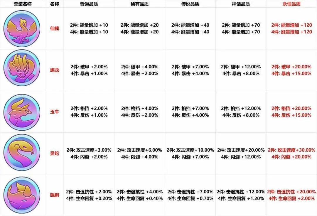 法师职业建议搭配完整的螭龙四件套以获得最大输出收益;辅助职业则优先选择仙鹤套装来提升初始能量值,确保技能快速释放;射手职业适合璃龙2+灵蛇2;坦克职业适合玉牛全套/鲲鹏全套。