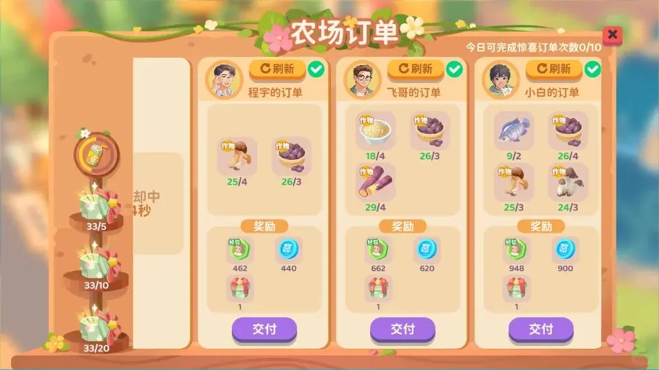 更新后优先做高经验订单,惊喜订单奖励扩地材料;