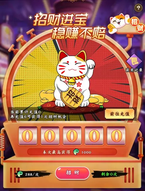 活动期间,累计充值可获得招财次数,使用招财次数消费勾玉可进行招财,招财获得的勾玉必定不少于消耗的勾玉。