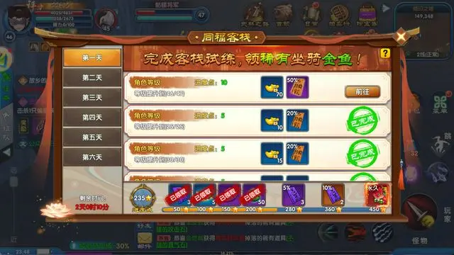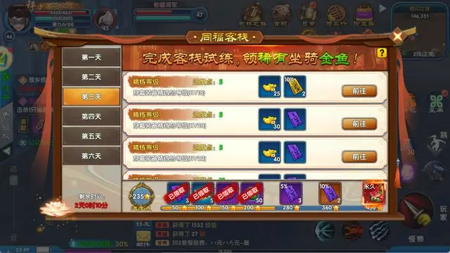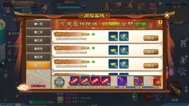开服后连续六天,每日将解锁一系列客栈专属任务。玩家完成相应任务,即可获取传说级坐骑 “金鱼”。该坐骑不仅外观独特,移动速度更达 5.5,为开荒冲级的核心助力道具。