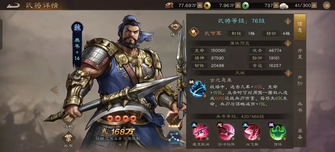 黄忠与典韦作为主力物理输出,需保证技能等级和装备强化到位。黄忠优先点满穿透技能,典韦需强化生存能力。
