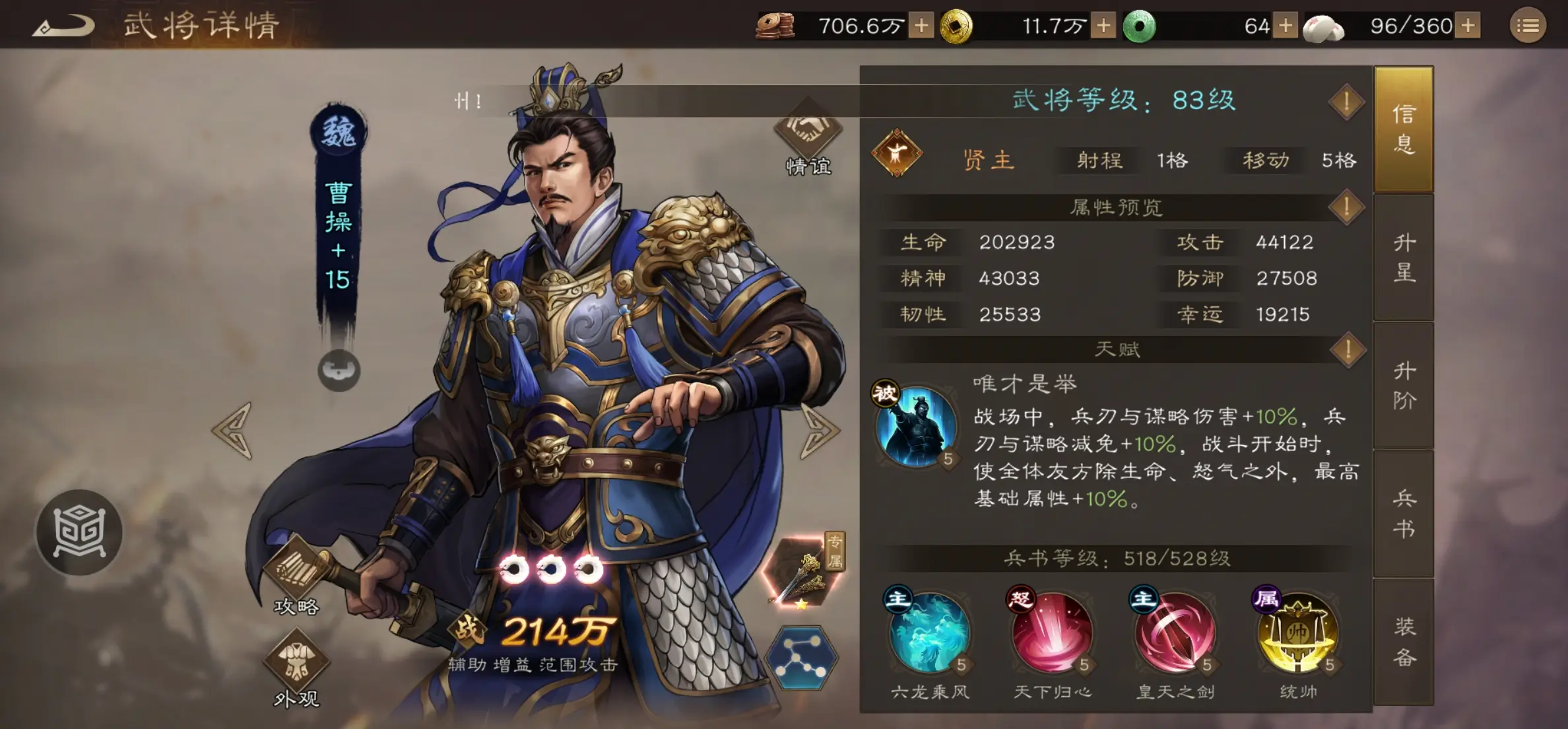 3.终极技能:天下归心施加全属性霸王效果,兼顾团队强化与范围谋略伤害。