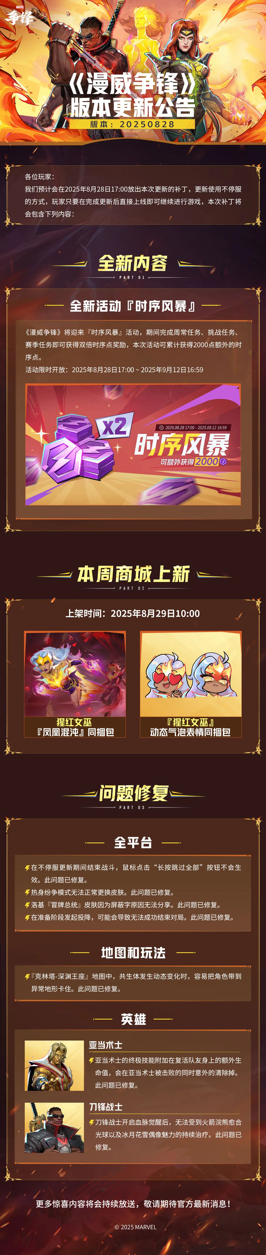 本次更新将于2025年8月28日17:00以不停服方式发布,玩家完成更新后即可正常登录游戏。本次补丁主要包含以下调整与优化内容。