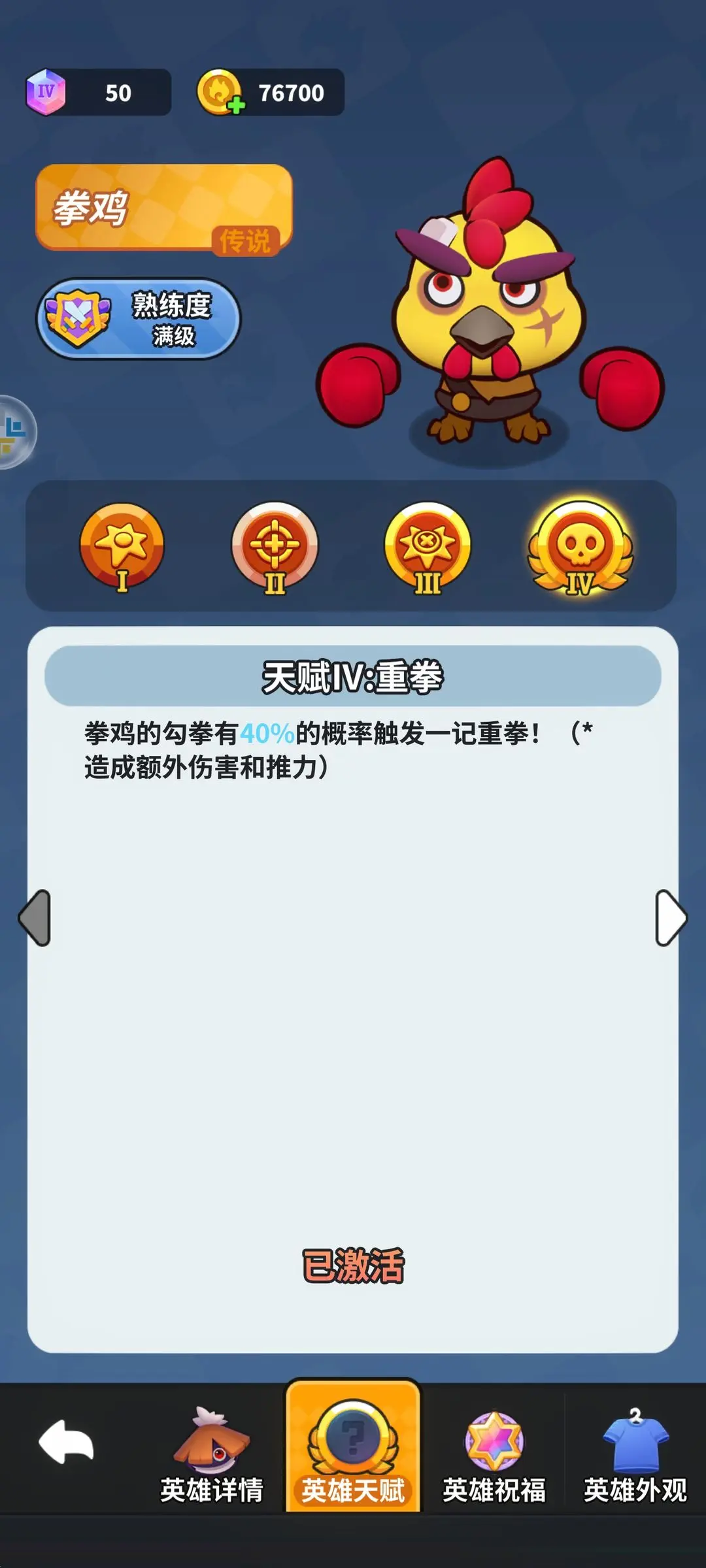 拳鸡单次碰撞可触发两次普通攻击,每次普攻有概率转化为勾拳,四天赋后勾拳可升级为强力重拳,造成高额伤害和推力。根据祝福组合不同,可担任启动器、主C或副C等多重角色。