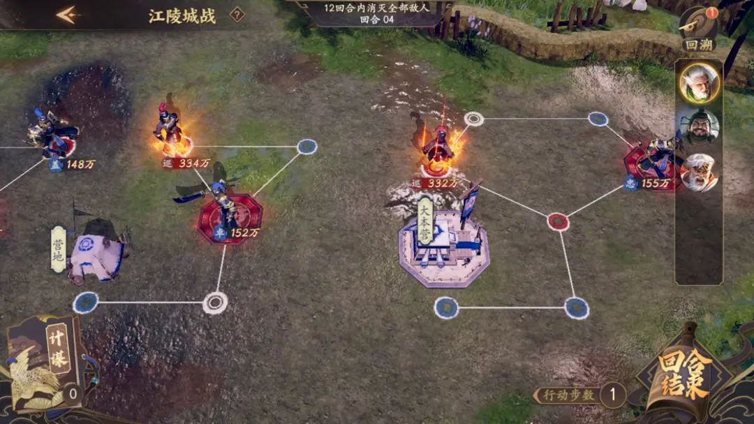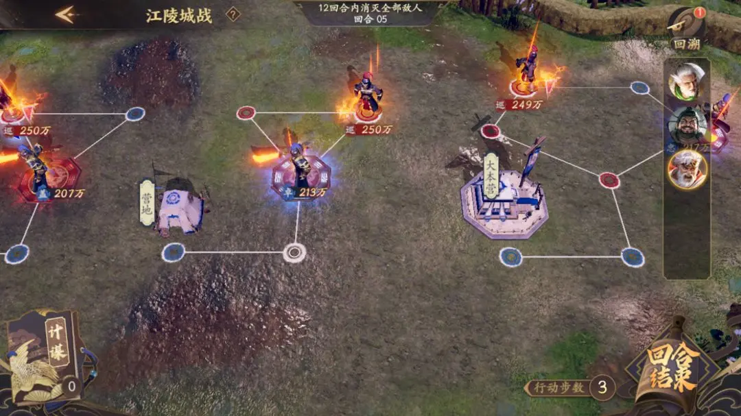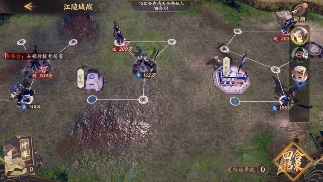 后续阶段根据战场情况灵活推进,当发现己方战力低于敌军且可能被巡逻队攻击时,应及时控制队伍向前移动规避冲突。江陵城战共有12回合限制,时间充裕不必急于求成。