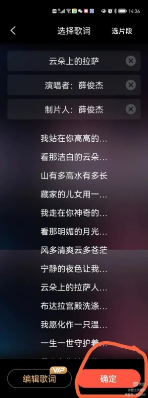 4.在选定歌曲后,截取合适的歌曲片段用于视频。
