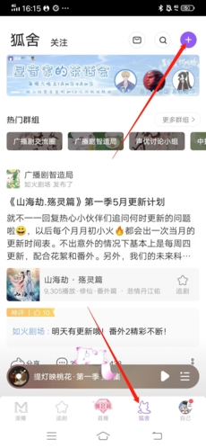 1.打开APP,先点击底部“狐舍”选项,再点击右上角的“+”按钮。