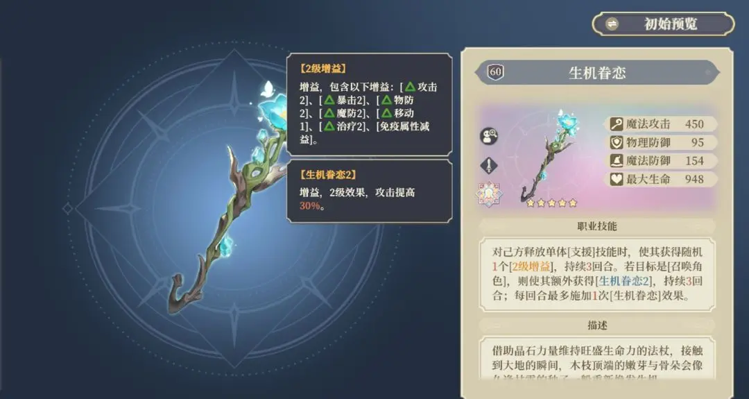 很专的专武,效果为花花量身定做,不好用,效果一般可以获得额外一个二级增益,额外效果也只多了个30%攻击提高。不过5星花花可以让buff效果翻倍,所以5星绿魔还是能搞一把的(虽然感觉不如生命仗)