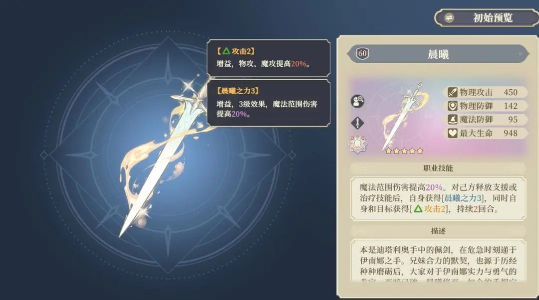 最好用的单手剑之一,不论是10%属性加持还是debuff驱散都很常用,长夜的15%伤害加成也非常强悍,但是只有5星才能有长夜2的增益。除了小索,sp王女也能使用。王女使用甚至比带专武效果好