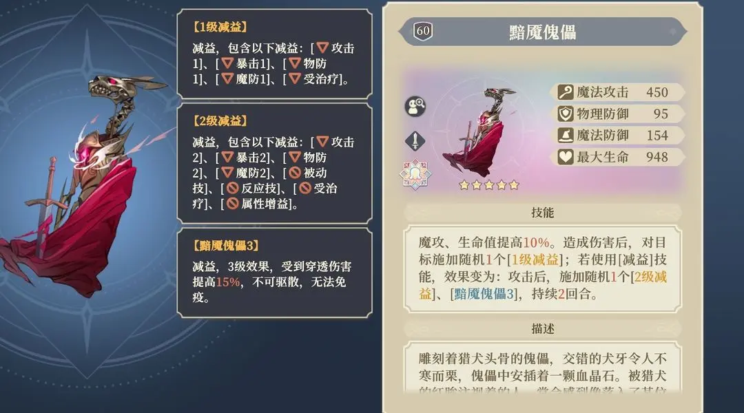 白值6的攻防有点低,但是充满法盾后会有15的属性加成还得可以看看的。谁能想到猎魔人面具会在很久之后才有点用。现在除了猎魔人,流星队和克拉拉也能快速获得法盾,从而获得增益效果。但低星的属性实在太低了,不是高星不推荐使用。