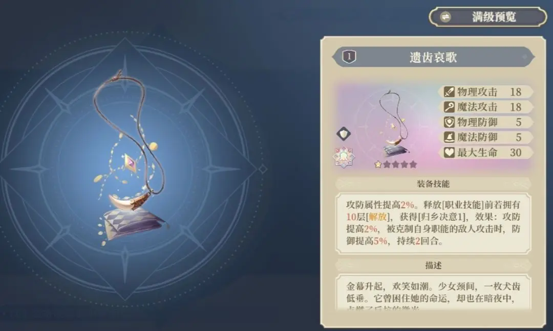 效果上看,物攻10%的提升,主动攻击3个及以上减益的敌人额外30%的爆伤,回合外16%的额外物理攻击提升。对于二王子来说也易达成,但是谁家二王子当输出用呢?本人是跑了5星二王子,但是筹划中的毒点不改,二王子永远当不了主c。并且二王子基本都是光环加燃烧瓶,偏向辅助更多。所以感觉更适合给猎魔人打一回合多动的高爆发玩法。