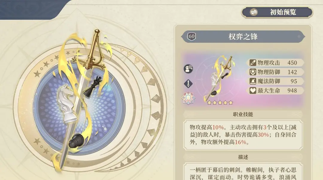 出乎意料的武器,效果可以说非常夸张。只要是单体就能有高达20%的暴击爆伤加成并且准备和反击的技能更能有40%的暴击爆伤属性。比sp萨曼莎的专武数值更加夸张,但是回看一下所有输出类型的重武器职业好像基本都是范围技能为主,所以目前可以说还是只有亲王适用。所以不推荐直接抽,等下期角色专武出来之后可以用专武碎片抽取。