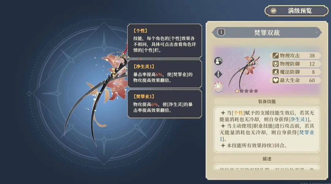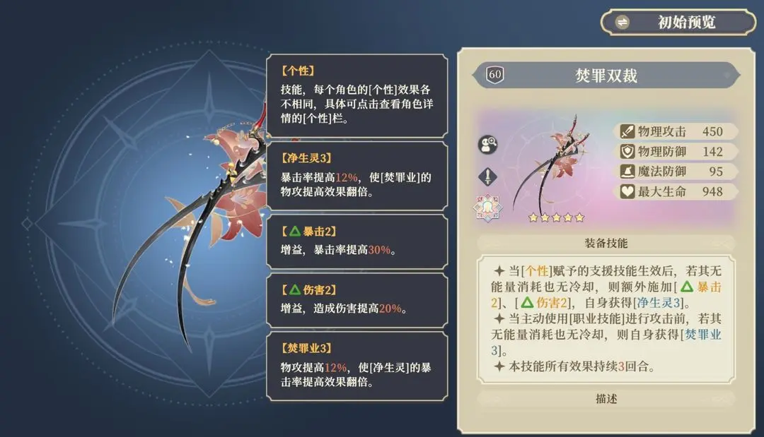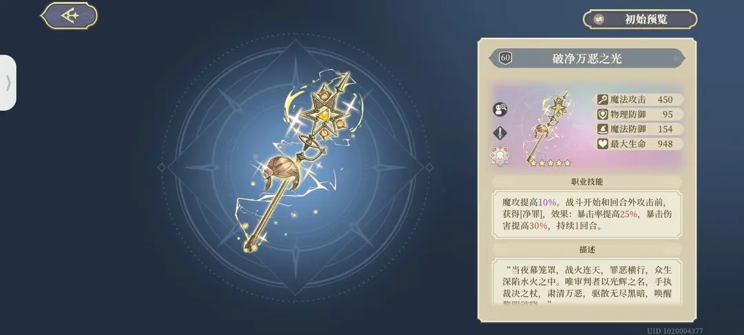 从第3期专武到现在为止,最强力法系专武,效果强大,触发条件简单。魔攻10%的提升和战斗开始和回合外攻击时额外获得净罪效果有恐怖的25%暴击率和30%爆伤,使得sp萨一跃成为最强群体角色。并且25%的暴击率搭配sp萨的天赋使得萨更好达到百分百暴击率(官方算计好的吧,铃兰sp角色怎么这么逆天)