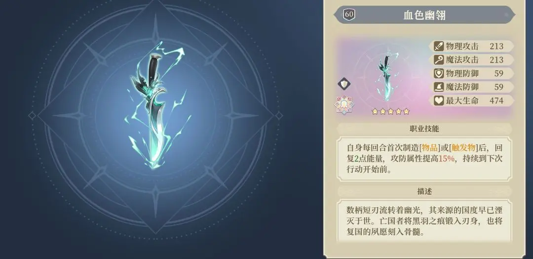 目前来看,只要创造物品或者制造触发物就能获得高达15%的攻防提升而且能获得2点能量帮助角色能量循环。能使用的角色有黑羽姐,sp王女,艾达,妹妹(但是这效果有点难受啊,持续时间有点短,sp王女和艾达可能难以维持状态)。相比黑羽姐,妹妹抽取的人估计更多,这件专武为了妹妹也可以抽取一个。(感觉更像妹妹专武))