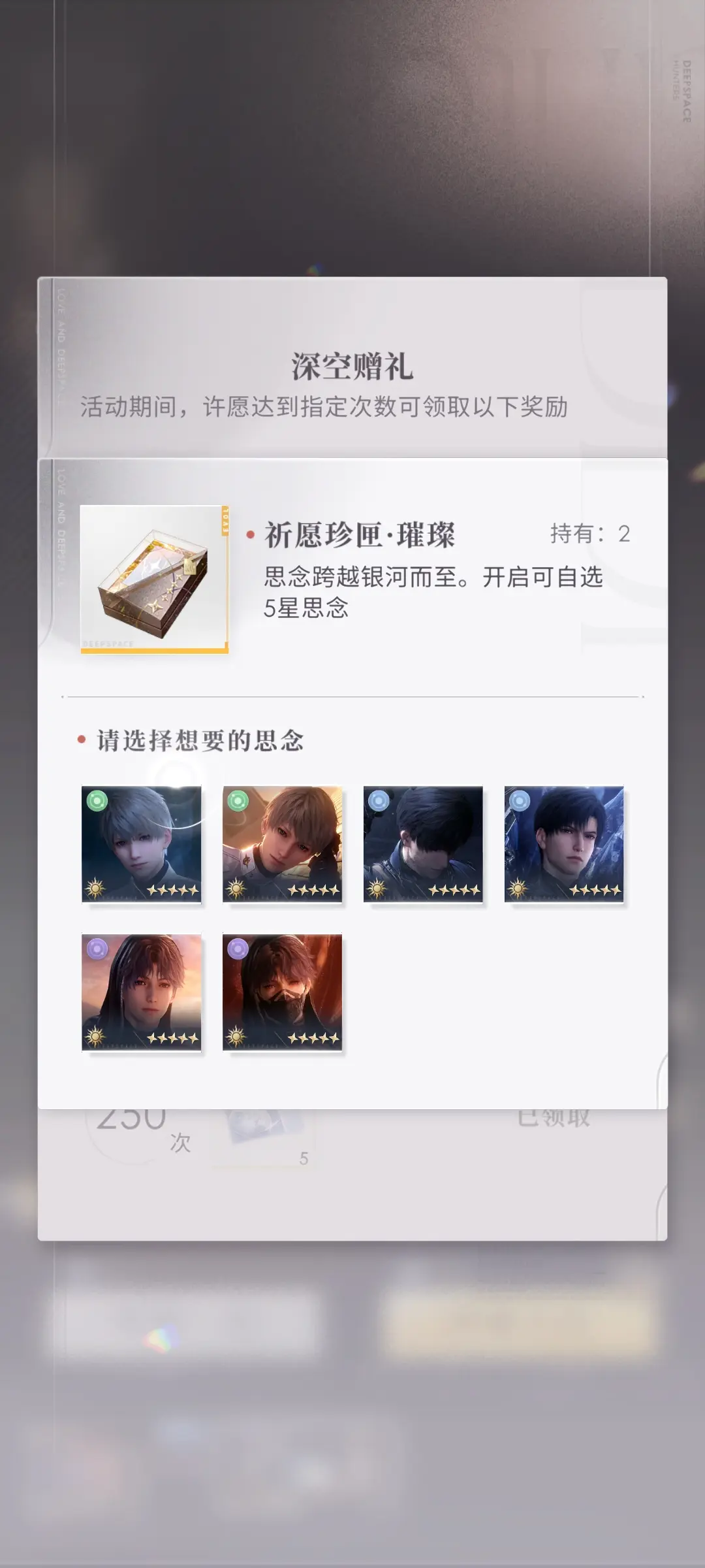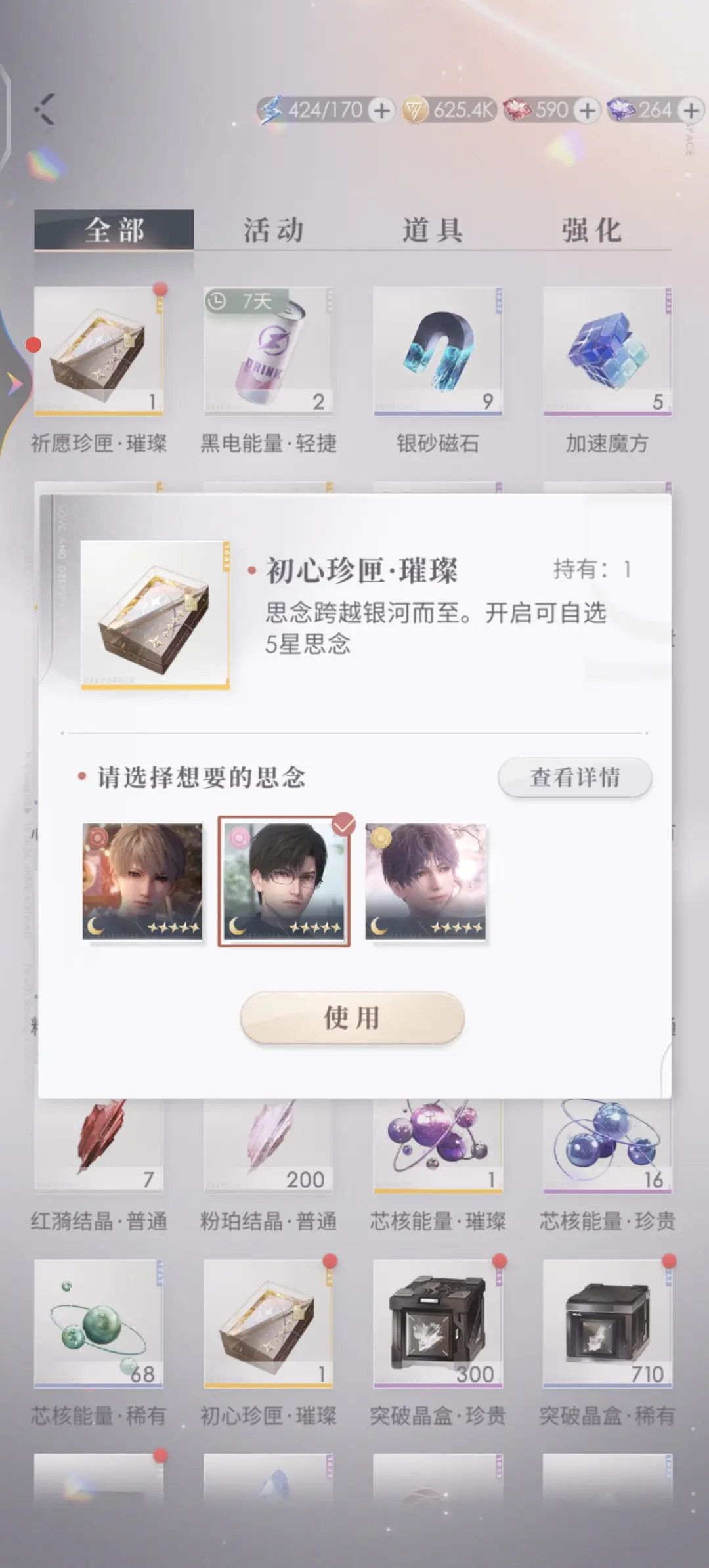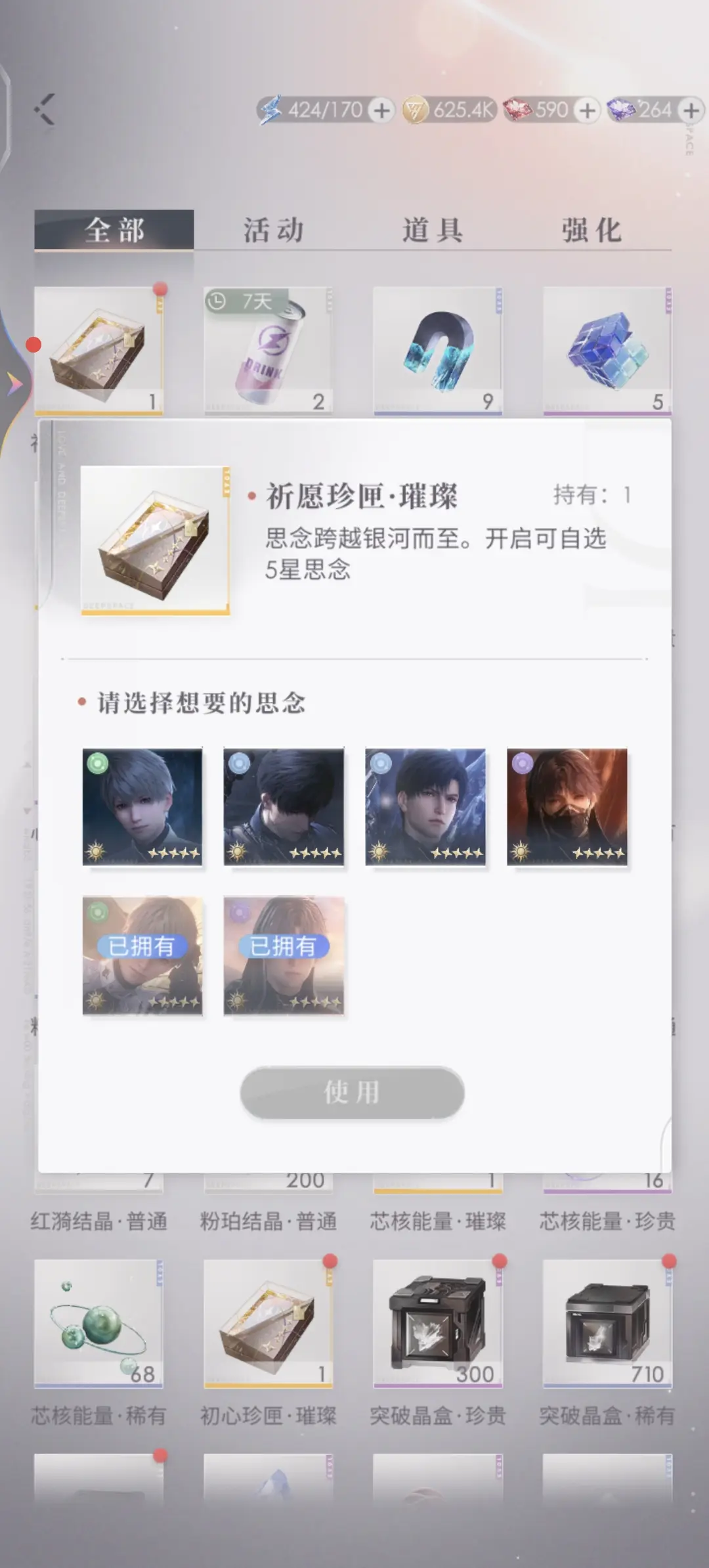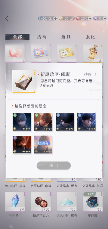 首先需要跟小伙伴们说明的是,祈愿珍匣有两种,一种叫做”祈愿珍匣·璀璨”,只有这个里面可以开出五星思念的自选;还有另一种叫做”祈愿珍匣·珍贵”,在这个道具箱当中可以开出四星思念,可以从其中选择一张自己想要的四星卡面。