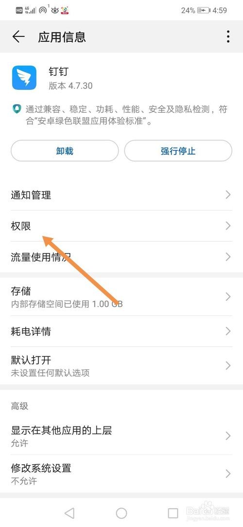 进入到钉钉的应用信息界面,点击“权限”。