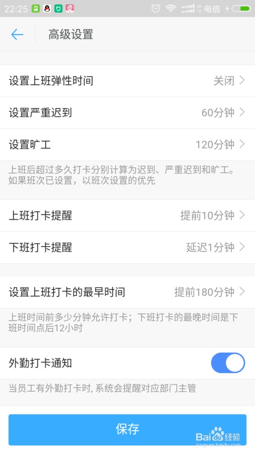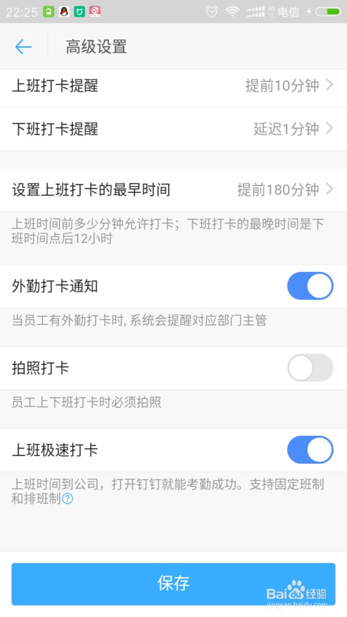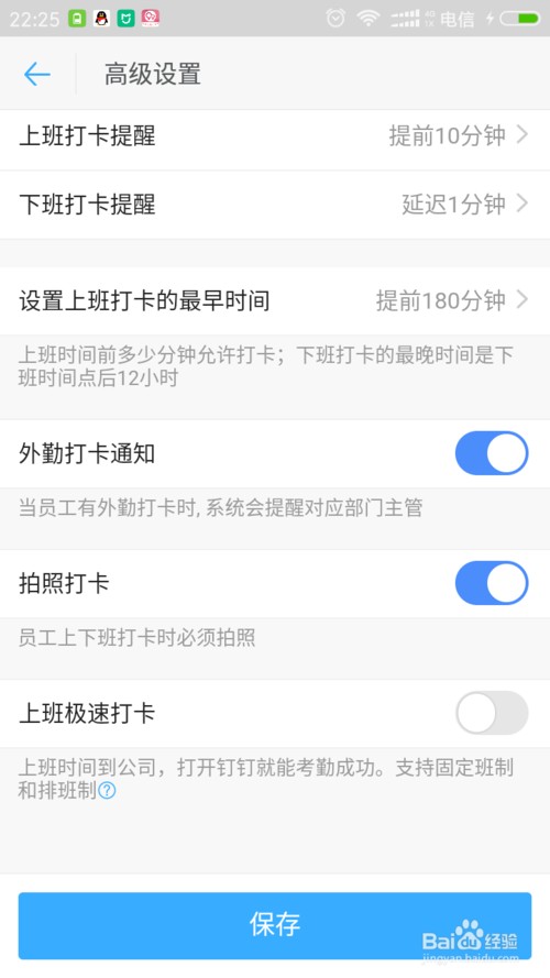 将拍照打卡的开关打开即可,点击保存按钮,这样就可以在下一次打卡的时候要拍照打卡了。
