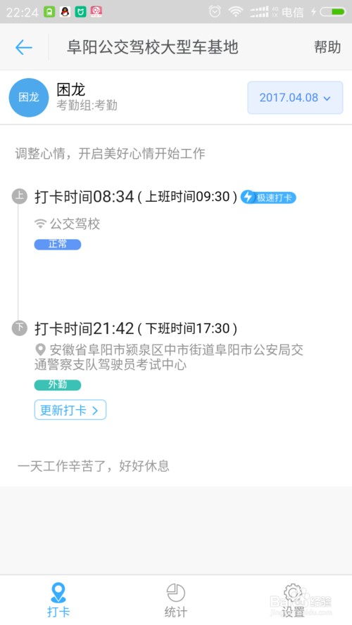 点击上图中下方中间的工作按钮,在弹出的页面中点击考勤打卡。