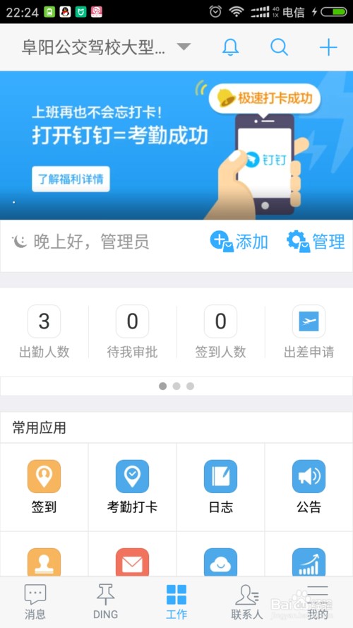 在手机上下载阿里巴巴的钉钉,然后登录自己的账号。此账号为管理员账号。