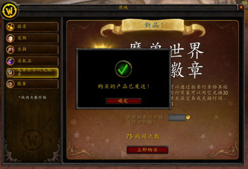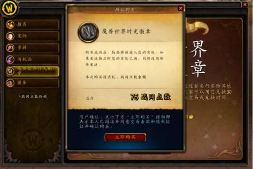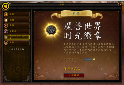 角色进入游戏后,打开【商城】并点选【魔兽世界时光徽章】标签