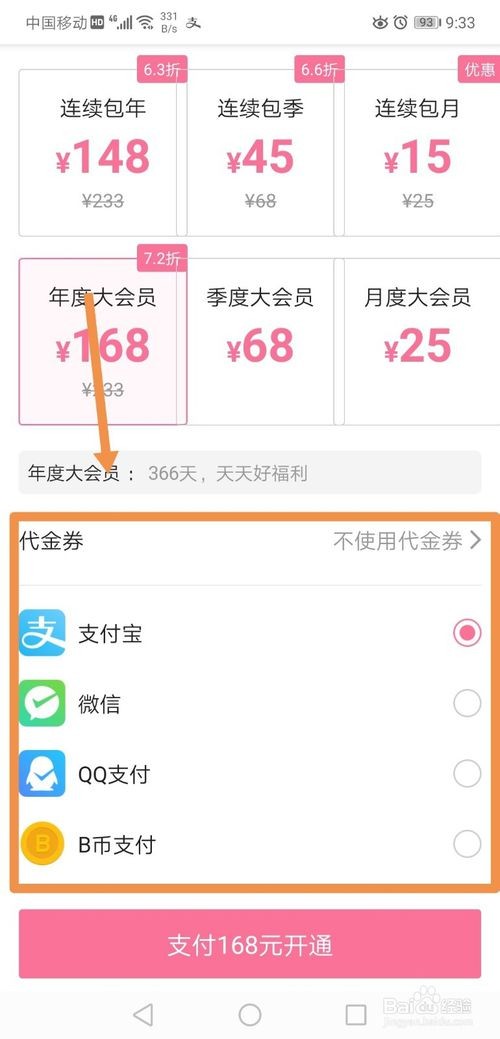 “连续包年”套餐只提供微信支付,“年度大会员”、“季度大会员”、“月度大会员”支持支付宝、微信、QQ支付和B币支付,其他套餐只提供支付宝和微信支付。