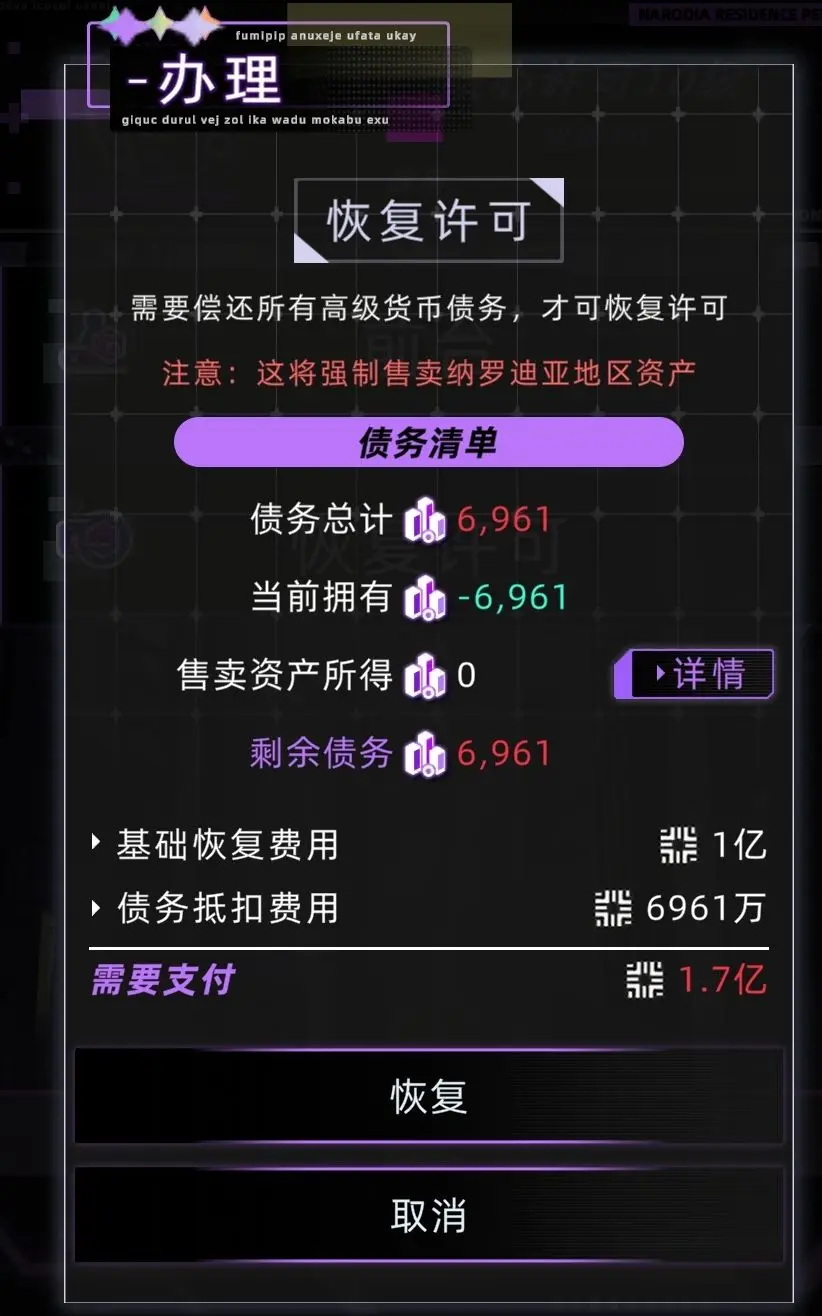 成年后可以在管理局交信用点补充欠款,核心许可信用许可恢复费用为1亿信用点,1股权=1w信用点,★而且还会优先抵押卖掉你在纳罗迪亚的房产