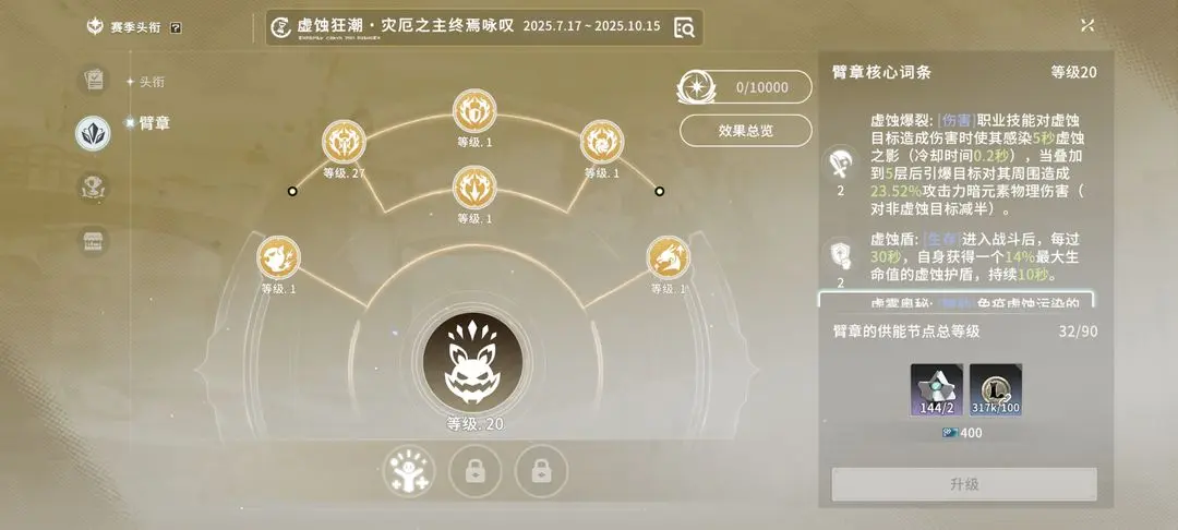 核心材料"虚蚀"通过赛季积分兑换(每周必换满),臂章零件用于升级主词条,赛季成就是主要获取途径。
