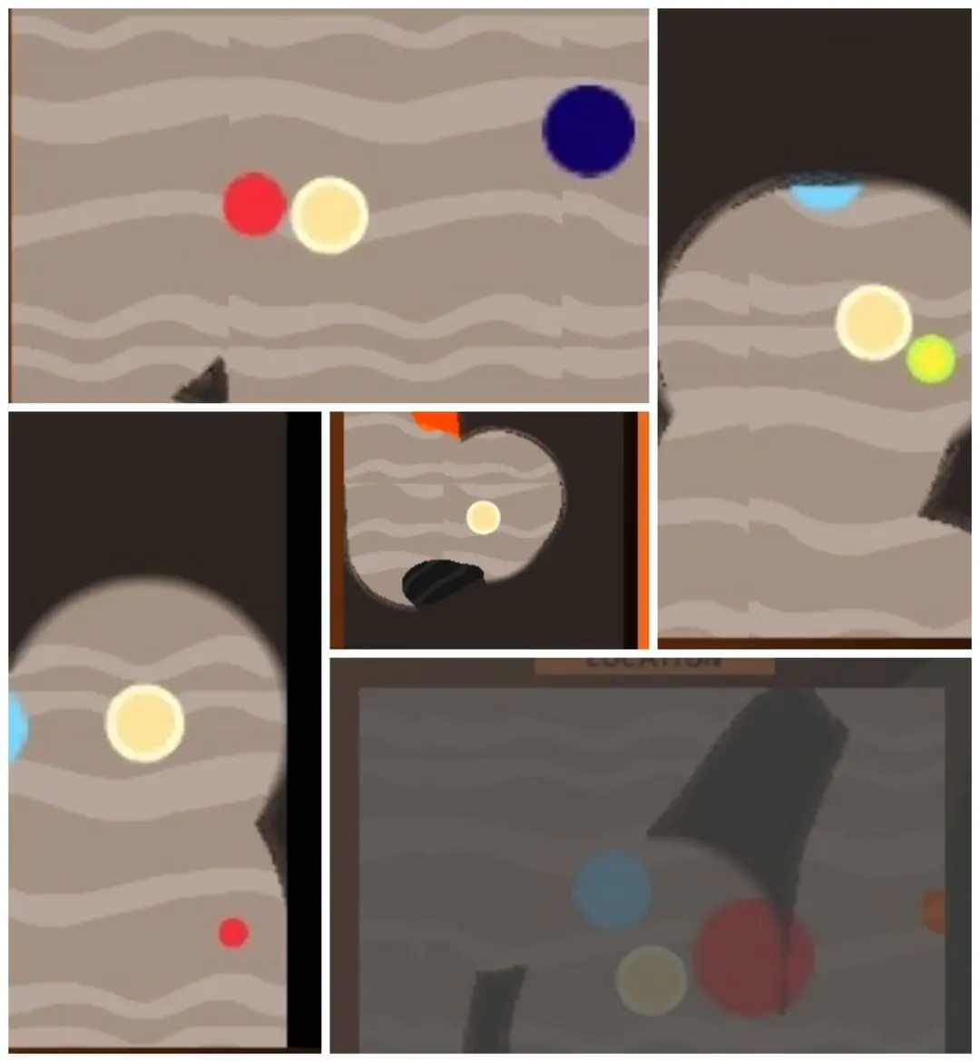 上图中①深蓝色圆代表山洞:大多数时候都有好东西,少数时候空无一物②红色会跑的大圆:是地图怪蜈蚣,一定要打,打死可以得到一堆东西③浅蓝色:代表矿石④红色中圆,代表怪物,会蓄力攻击⑤黑色:石油,可以给自己的钻机加油,每个区域一块油田⑥红色小点:小怪⑦黄色:藏在岩浆或石头里的展览品⑧红橙相间:是岩浆,岩浆里偶尔也有展览品