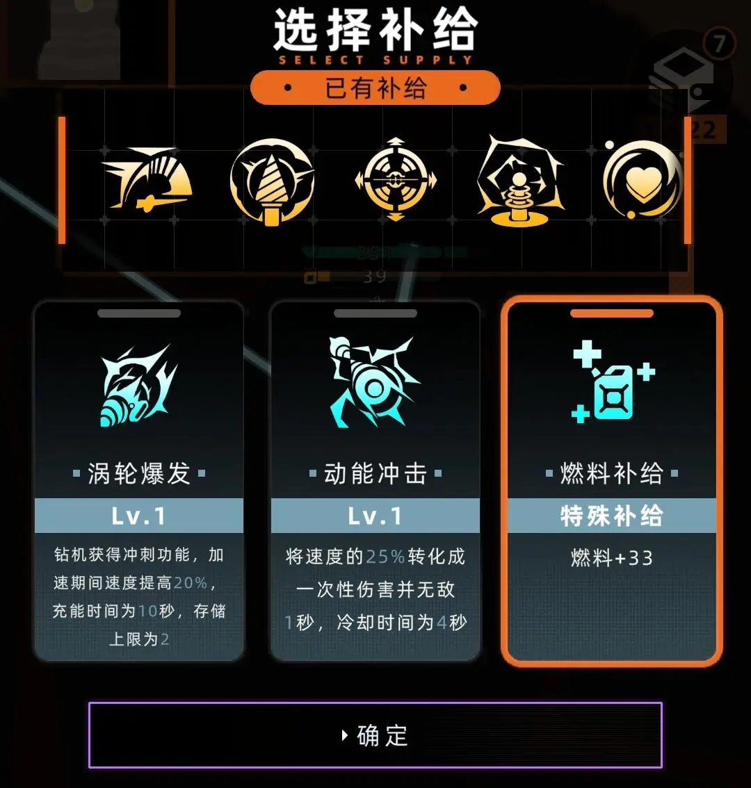 进度条可以获得挖矿技能和油量补给,进度条到LV22时,就可以获得油量补给,可以通过挖掘矿石、岩浆表层和击杀怪物增加进度条