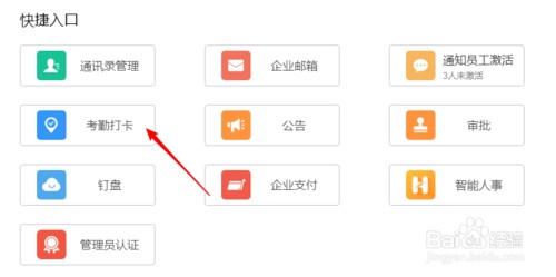 在电脑上的浏览器中进入钉钉管理后台,点击快捷入口下的“考勤打卡”。