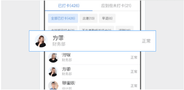 如果员工的主管是考勤组人员,那么就可以看到员工的照片及考勤情况。钉钉设计的初衷,就是让管理人员,实时查看员工的考勤统计。管理人员可随时查看团队当日、当月出勤情况;员工请假、加班、出差外出等,审批数据自动同步。