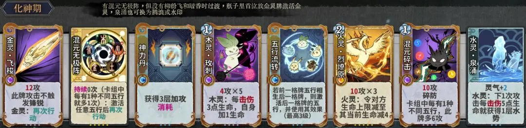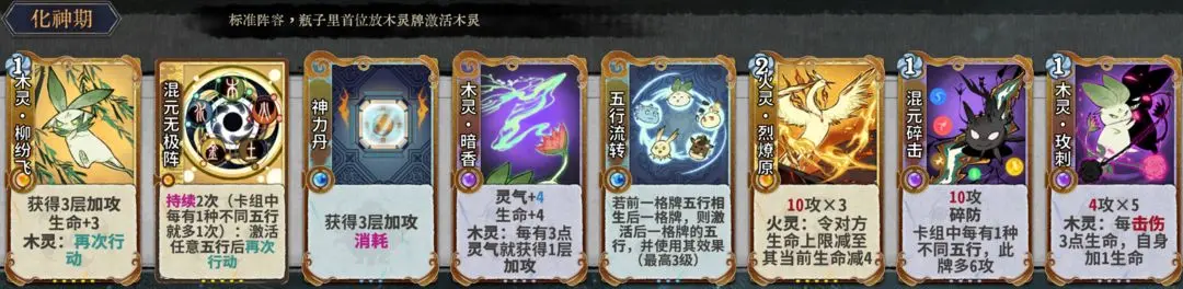 元婴期关键牌:神力丹、聚灵丹、木灵暗香、木灵巡林、木灵玫刺、五行流转、混元碎击。