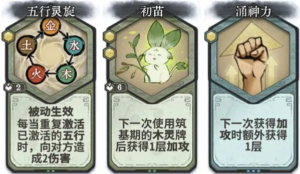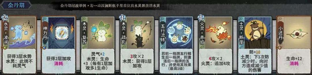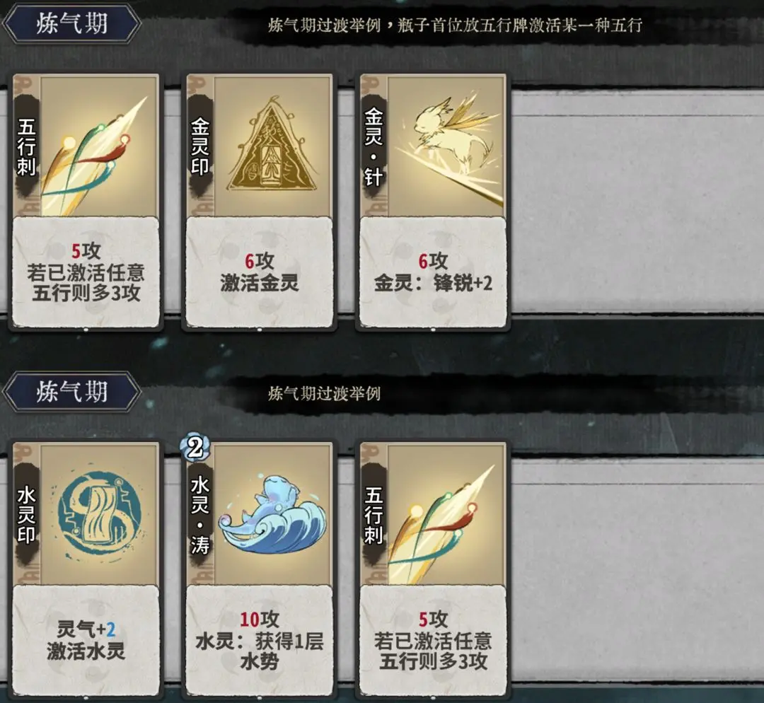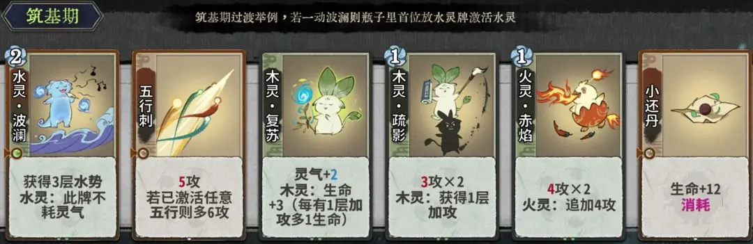 第2-3轮可在筑基大量换牌,提升战力。筑基过渡优先一动水灵波澜(瓶子里首位放水灵牌激活水灵),搭配疏影、赤焰、五行刺。从第4轮开始,尽量不换牌。