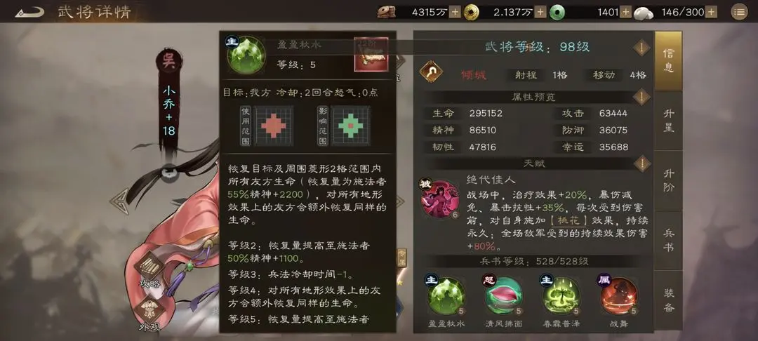 天赋绝代佳人,可以提供20%治疗量和35%暴击抗性爆伤减免,同时有一个全场光环,可以使敌人受到dot增加80%,完美适配吴国的焚烧dot流,同时每次受伤前都可以对自身施加桃花buff,格挡率+25%,可无限叠加,触发一次格挡后消失,可以说是一个格挡抗暴都拉满的奶妈了,非常肉,配合孙权和被动提供的爆伤减免,开局无条件拥有90爆伤减免,哪怕带着刘备暴击伤害都跟不暴击一样