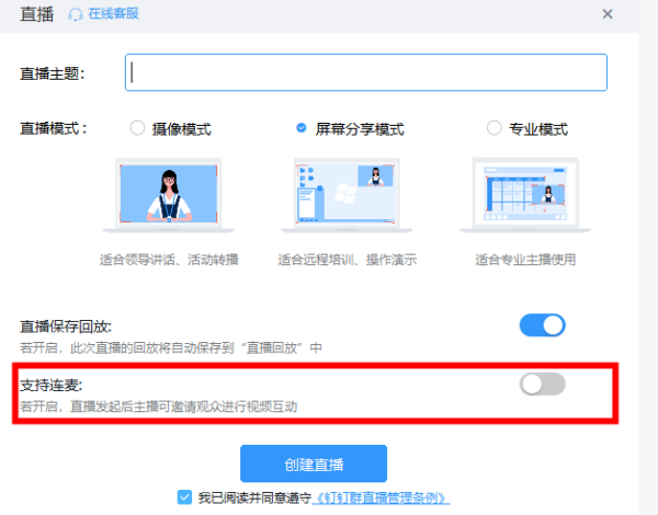 手机端:【手机钉钉】-【消息】-【群聊】-【右下角加号】-【群直播】-【设置】-开启【支持连麦】