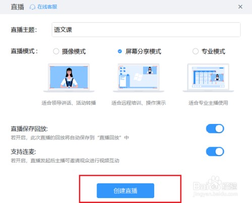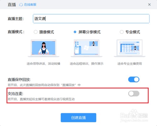 第二步进去创建直播界面,输入直播主题,选择模式,开启支持连麦,如下图所示: