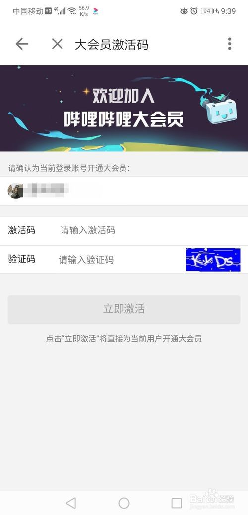 同样在“成为大会员”界面,点击“激活码开通”,输入相应的激活码和验证码,并点击“立即激活”,激活成功可以获得大会员身份;
