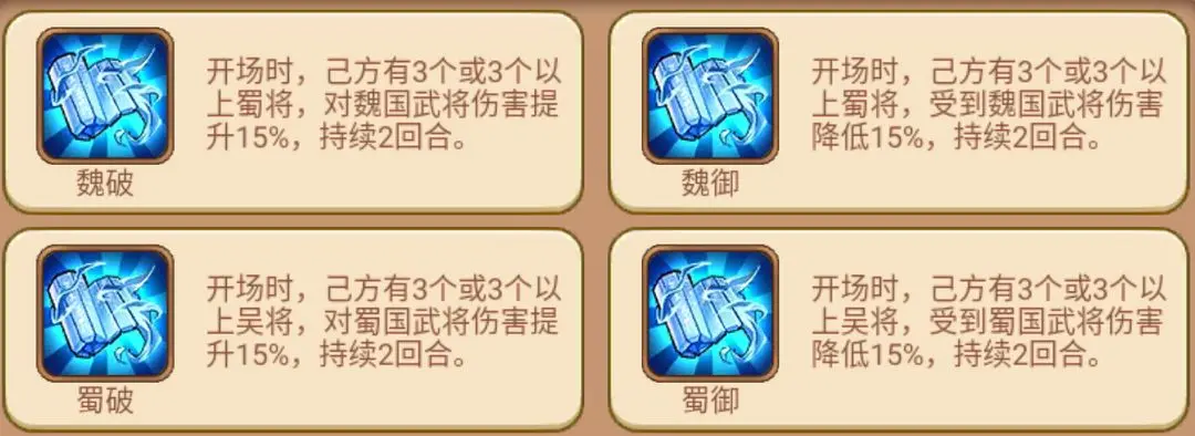 副词条:魏/蜀/吴/群攻击、魏/蜀/吴/群防御。