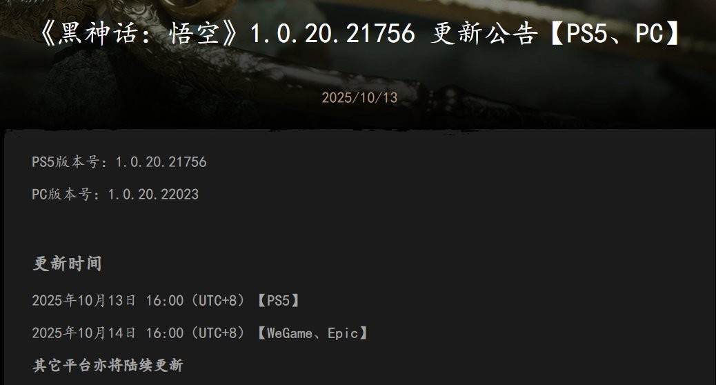 10月13日黑神话悟空公布大型优化补丁,PS5率先更新,14日PC端补丁在Wegame与Epic上线,Steam却未在其中。此次PC端更新集成新技术、优化性能,还修复怪物、性能、本地化等问题,玩家可按需体验新内容。