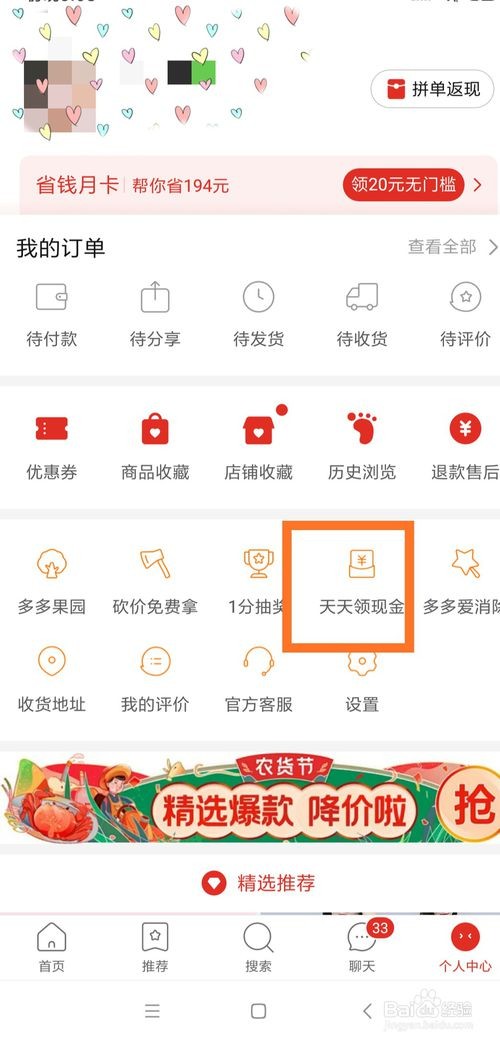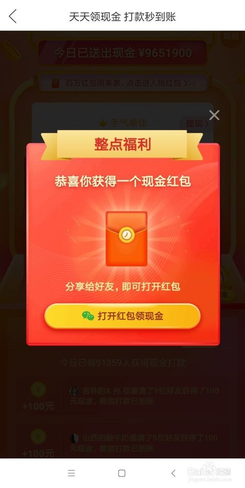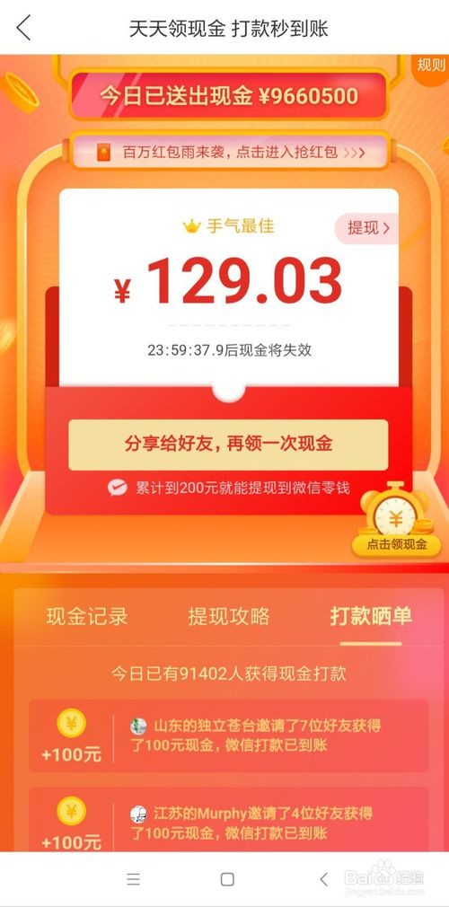 在个人中心-点击“天天领现金”-点击“打开自己的现金红包”可得到自己的现金红包